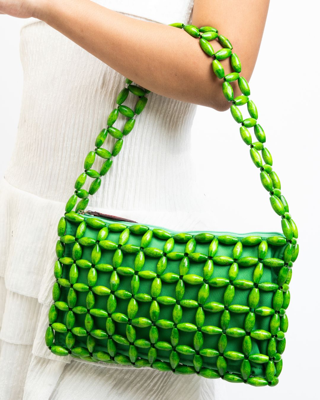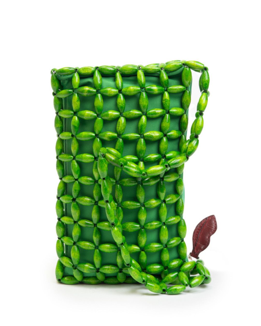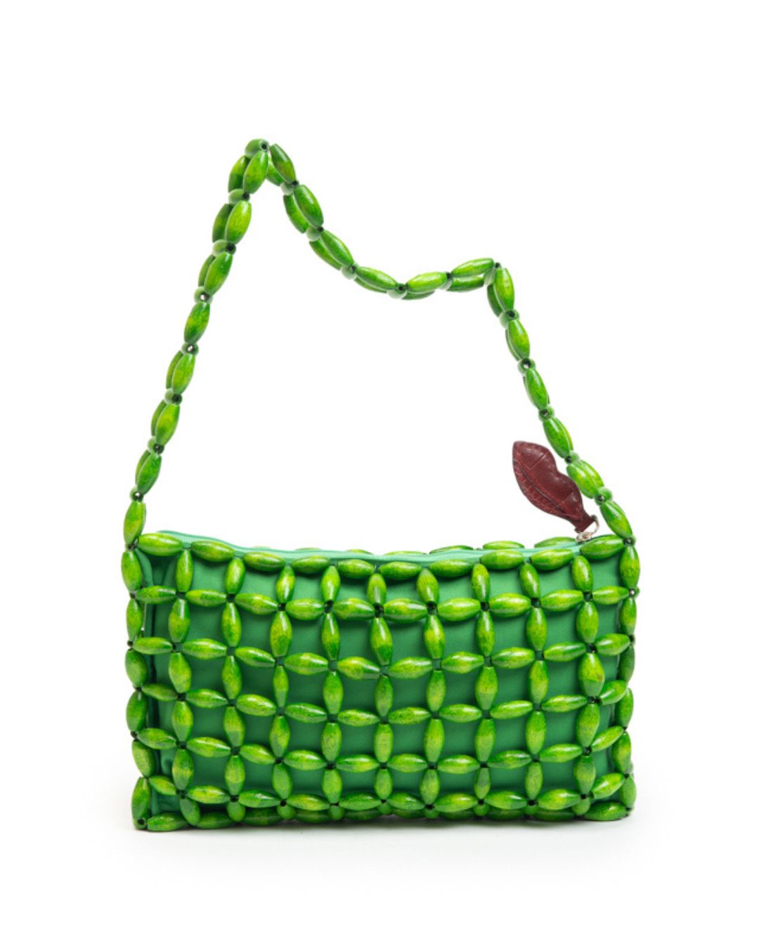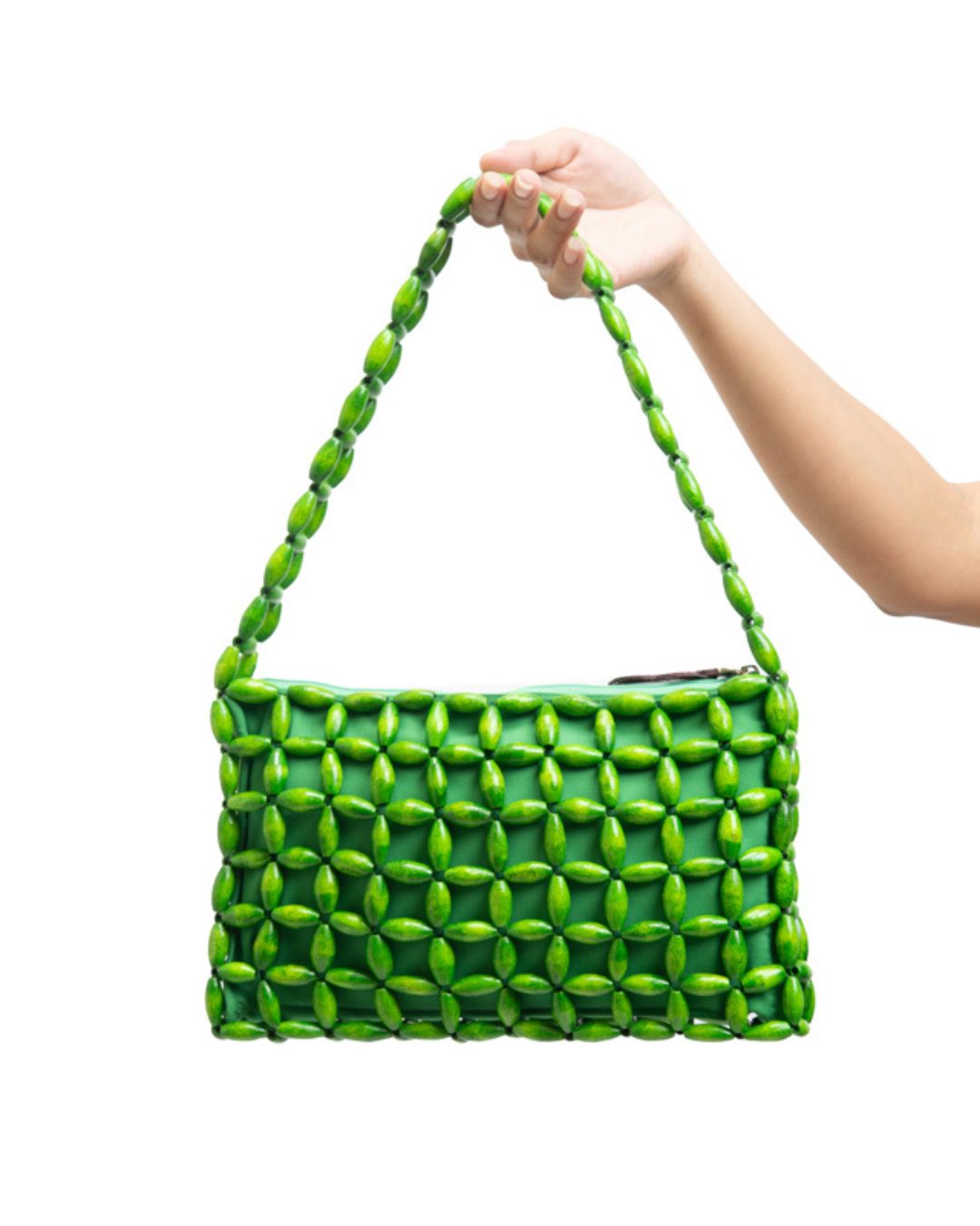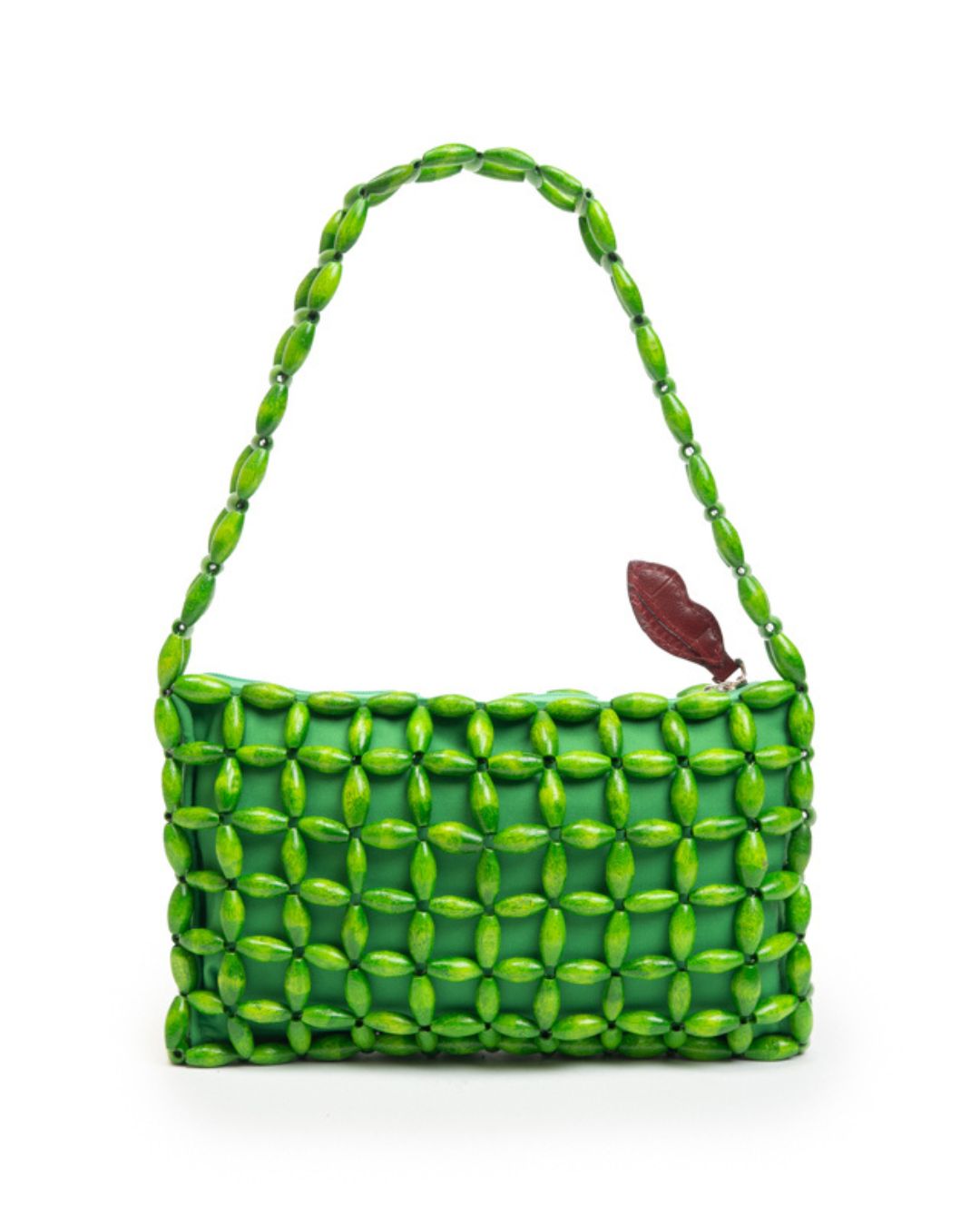 She’s our latest obsession—laced with wood beads woven by hand into a so-hip-to-be-square pattern, which gives each of these petite shoulder bags their own unique finish.