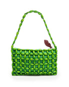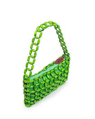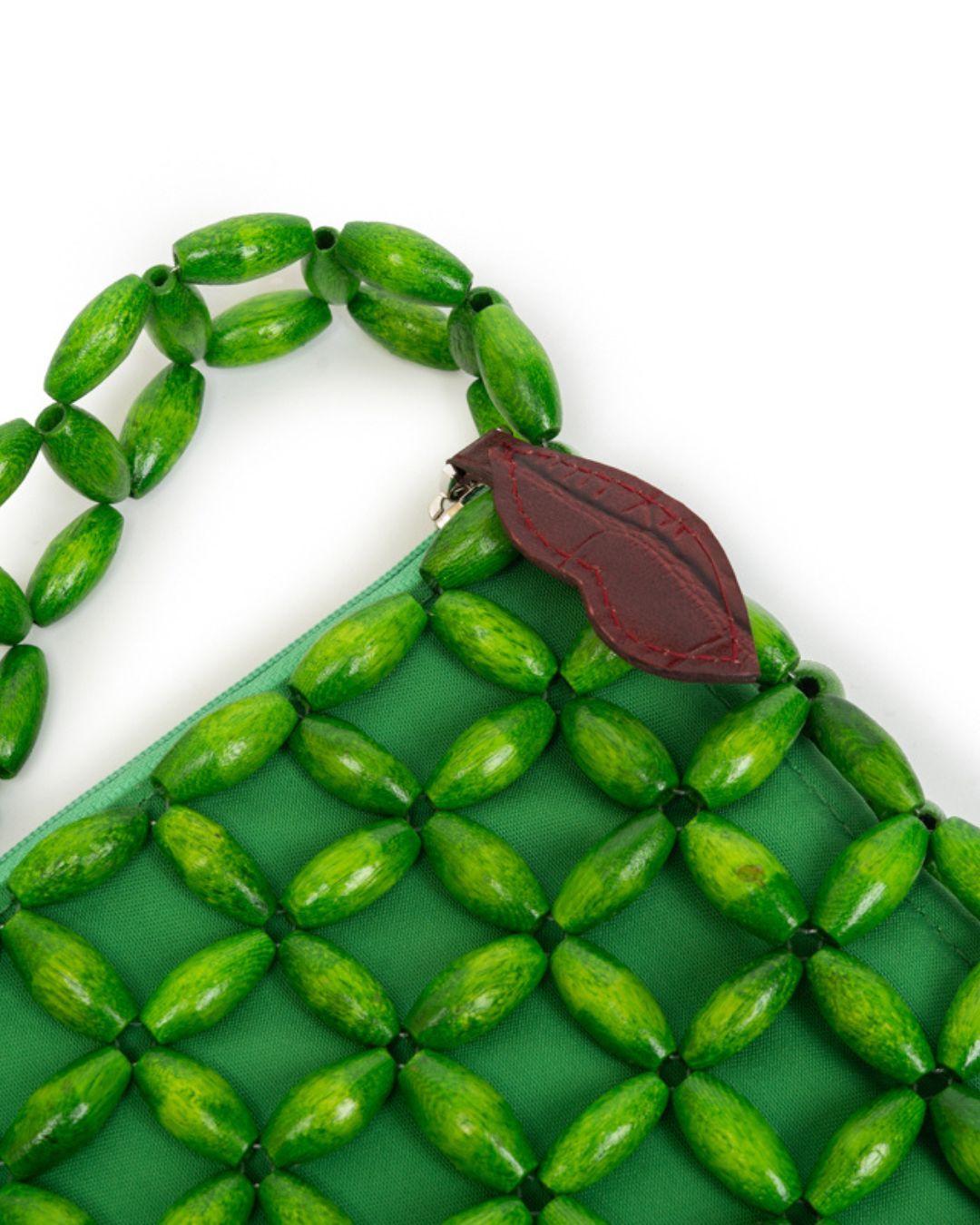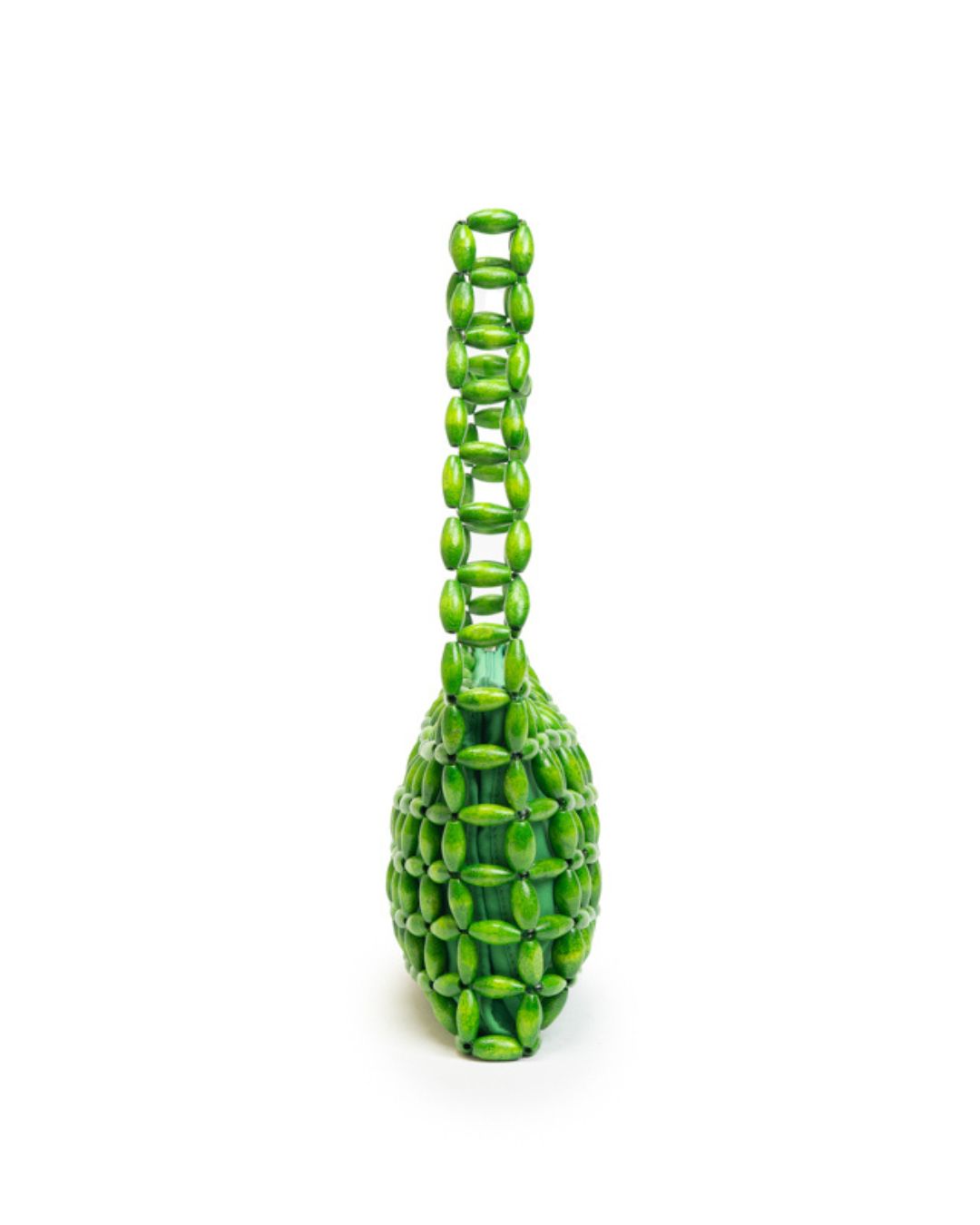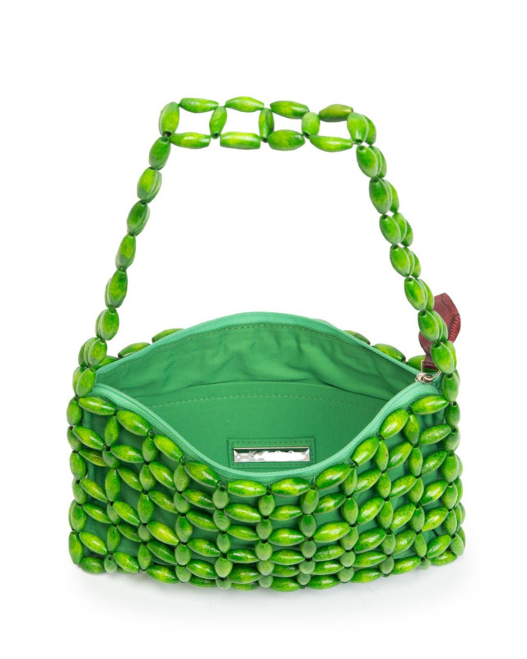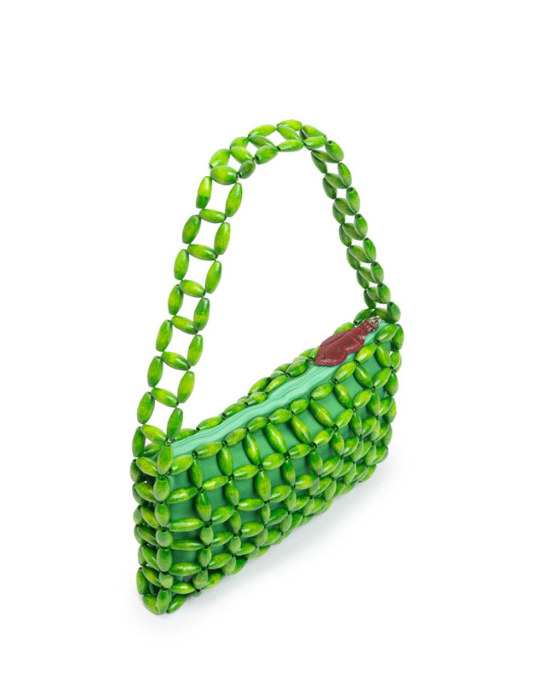 She’s our latest obsession—laced with wood beads woven by hand into a so-hip-to-be-square pattern, which gives each of these petite shoulder bags their own unique finish.