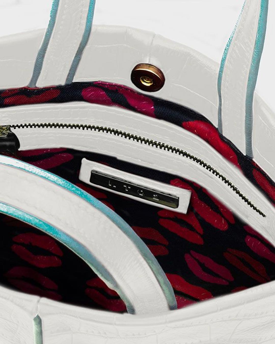 Inside, our lips lining makes a cameo and it keeps it all together with a smart snap closure.